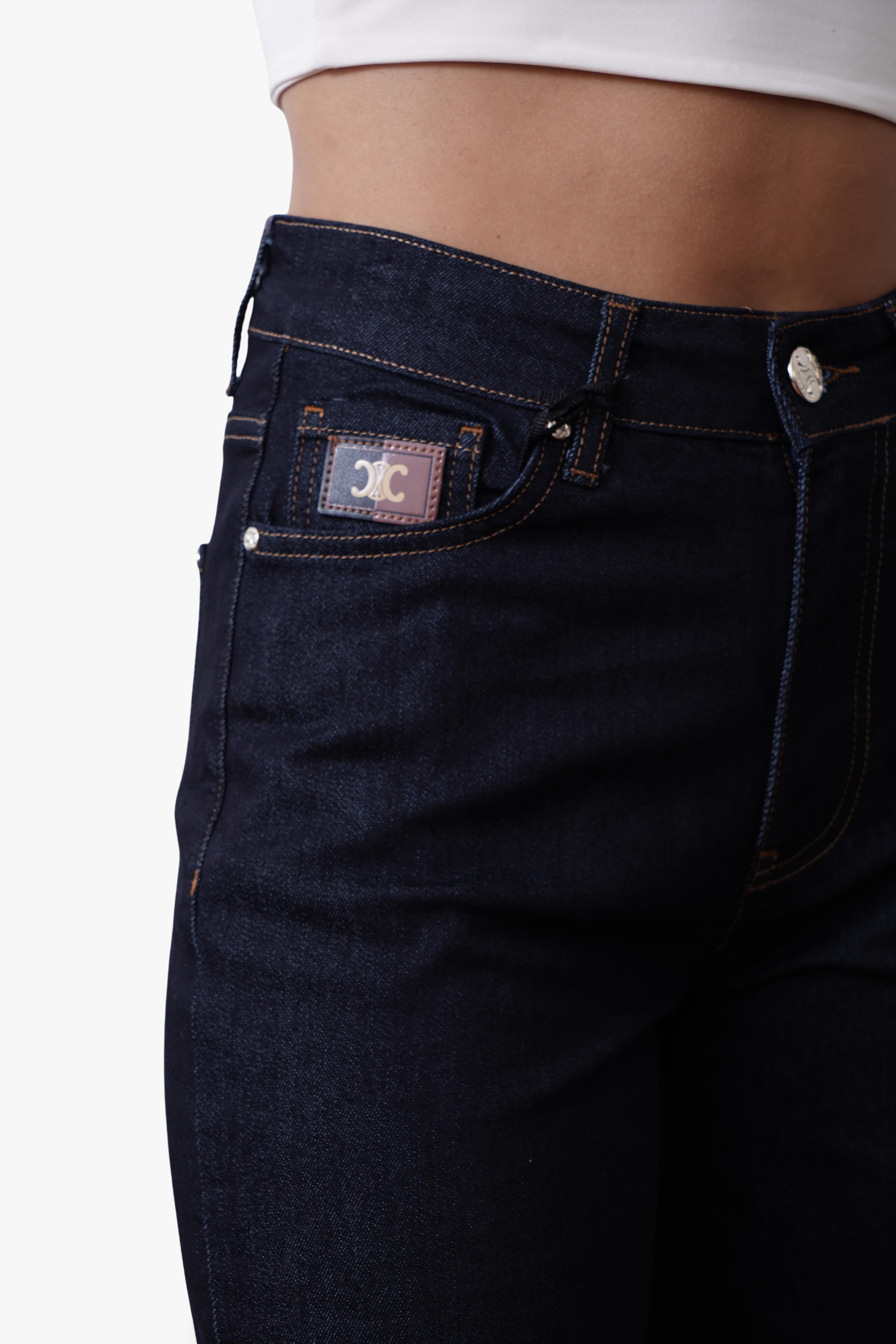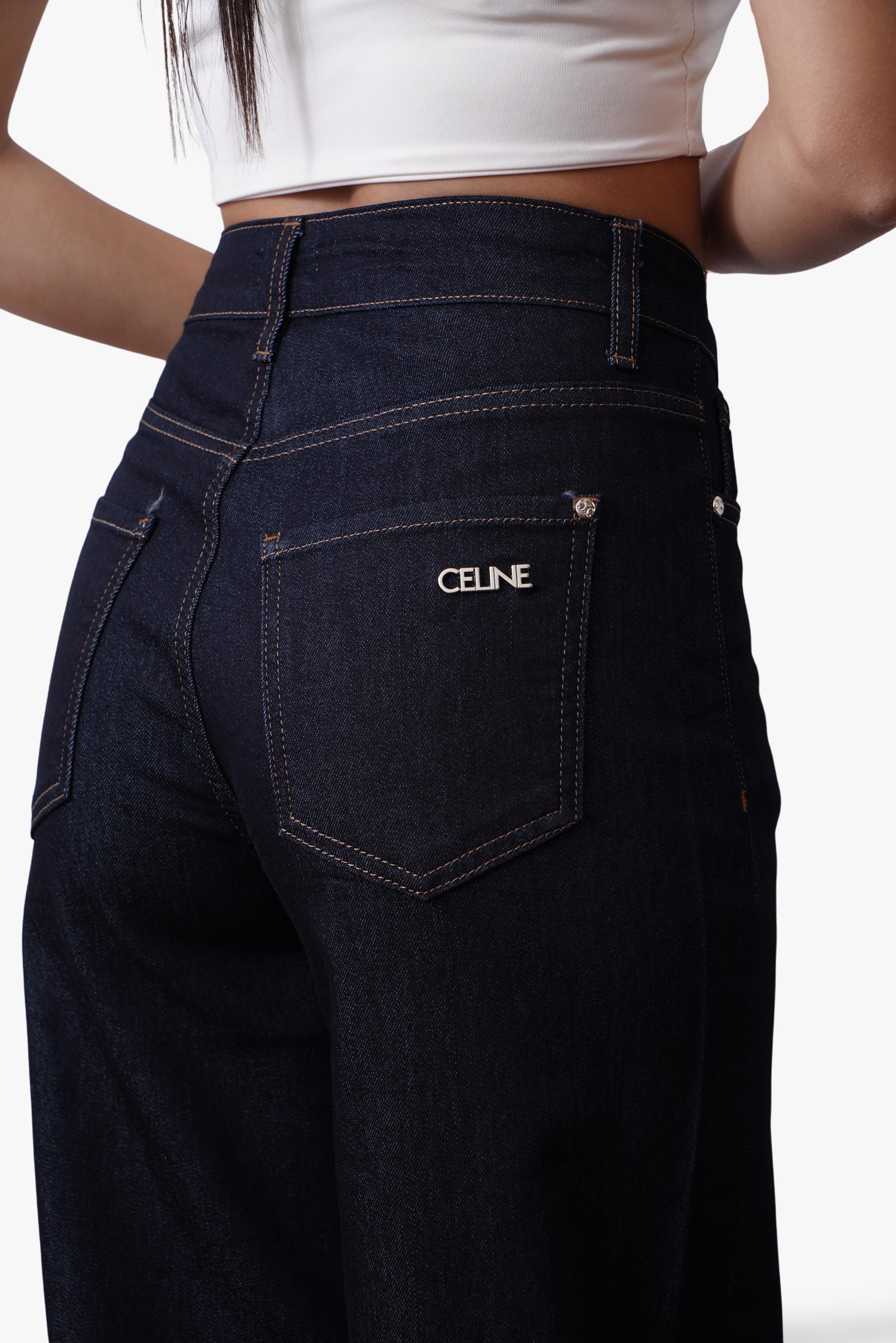 A statement denim piece featuring a high-waisted fit, wide-leg silhouette, and cuffed hem. Designed in a deep indigo wash with signature Celine logo hardware at the waistband, these jeans blend modern style with timeless elegance.