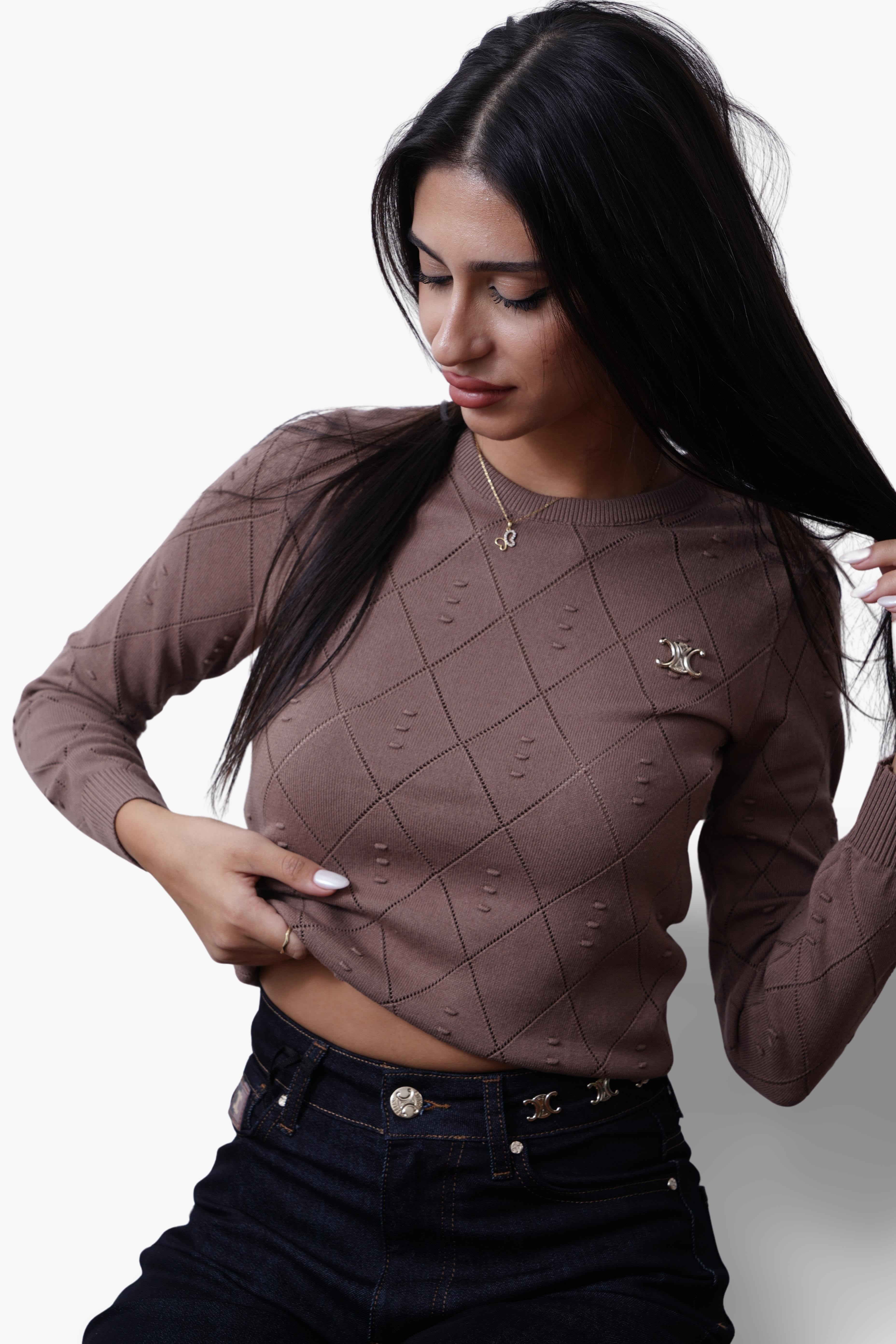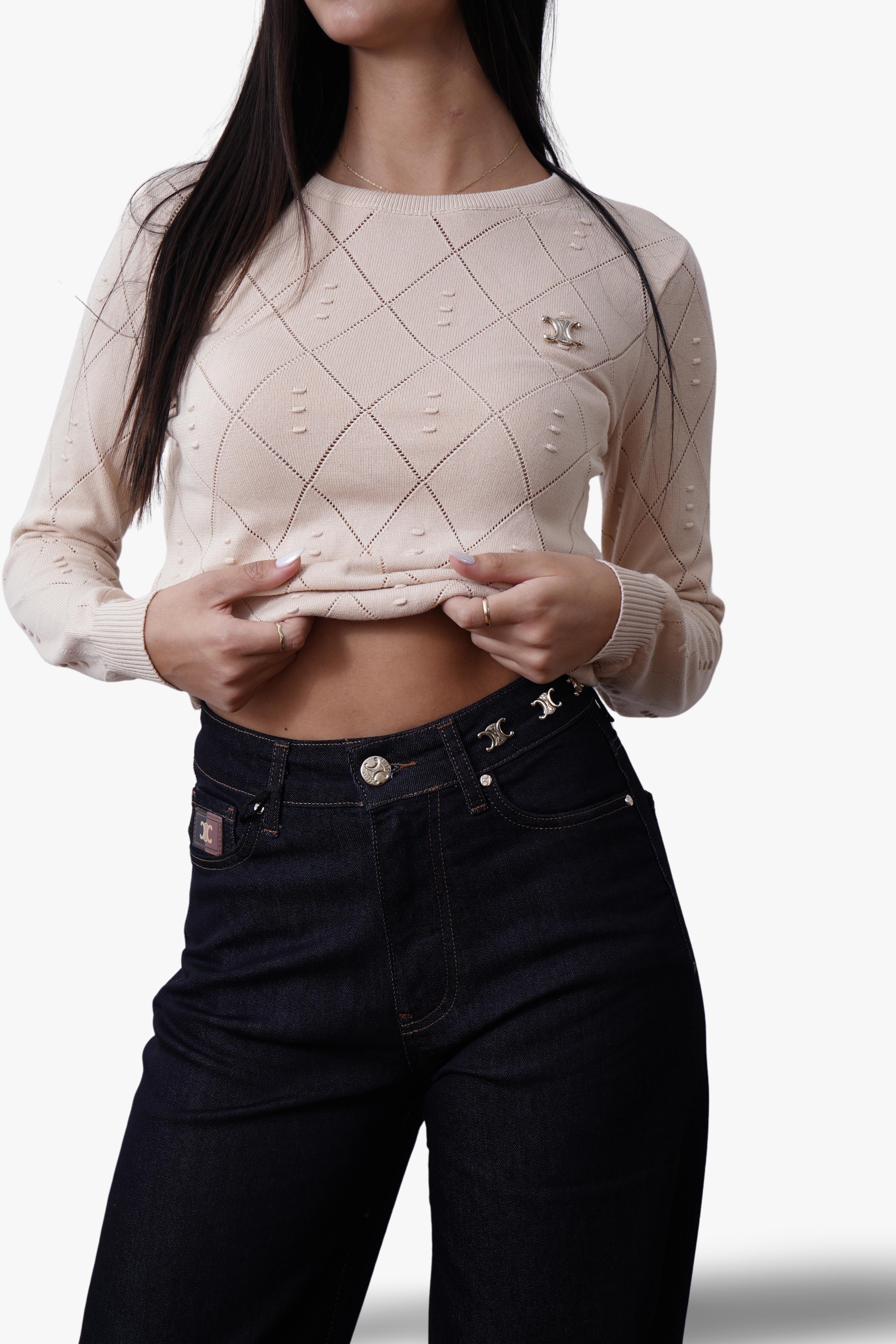 A timeless knit top featuring a delicate diamond pattern with subtle cut-out detailing and the signature Celine emblem on the chest. Designed in a slim fit with a soft, lightweight knit, this piece blends elegance and versatility—perfect for pairing with jeans, skirts, or tailored trousers.