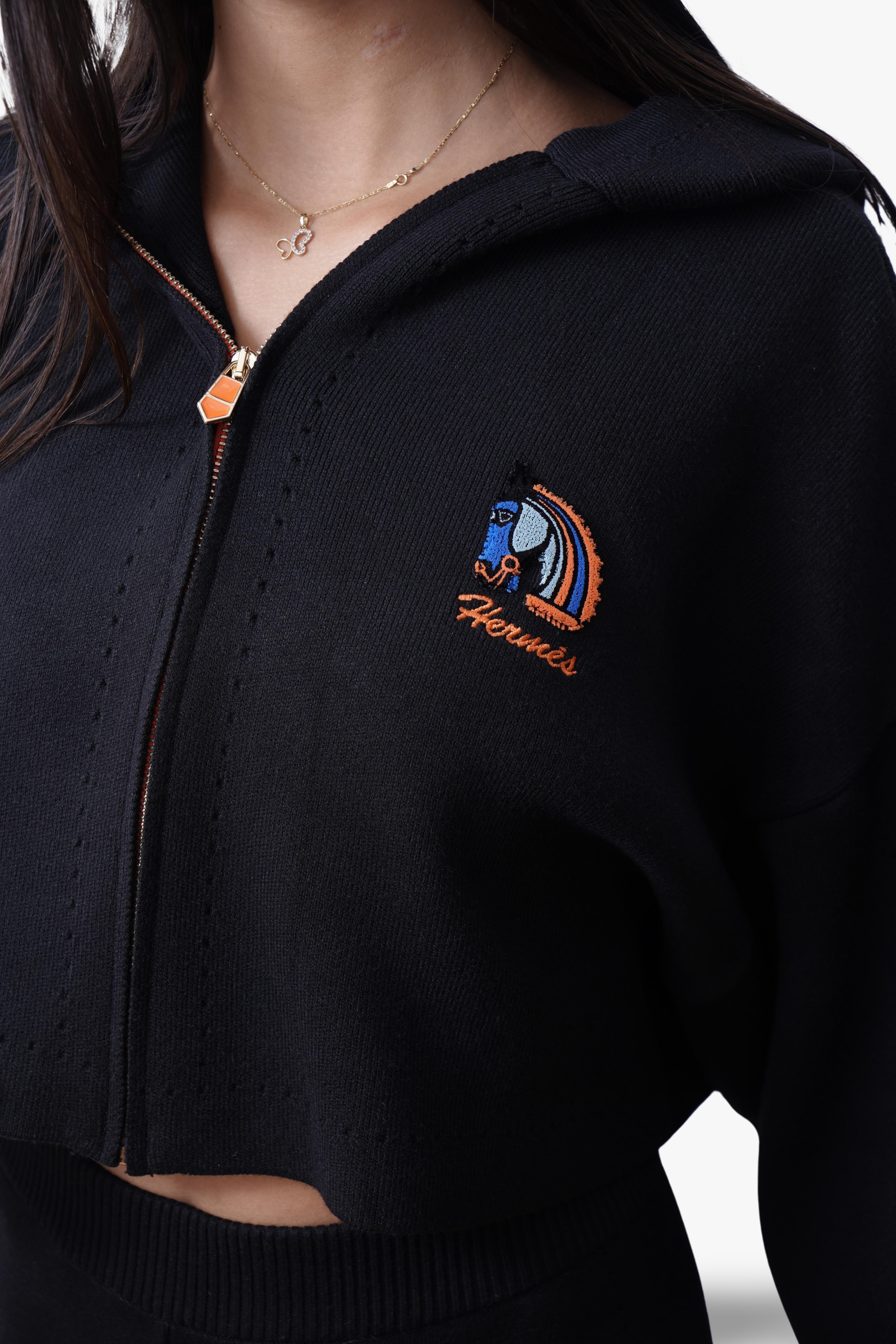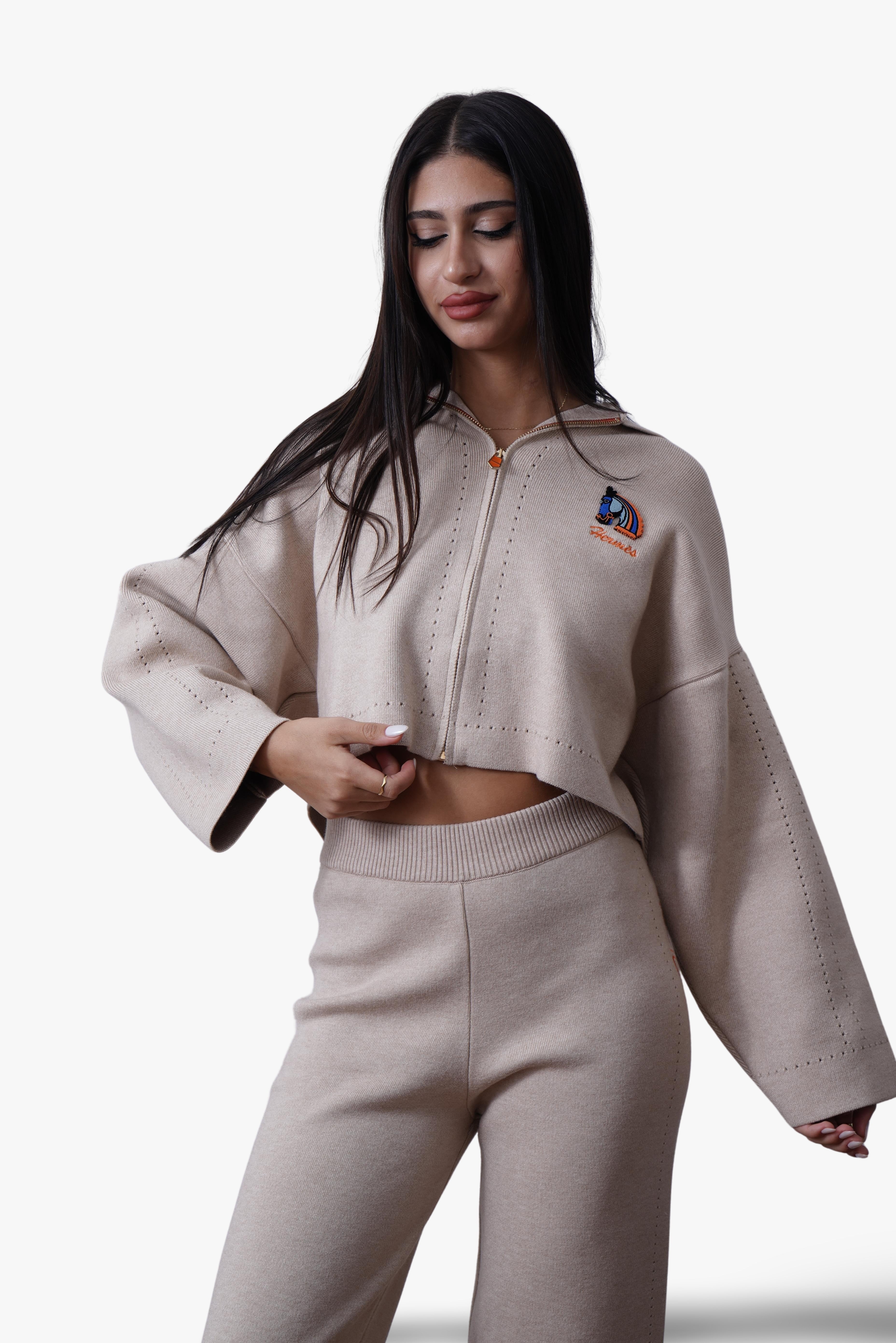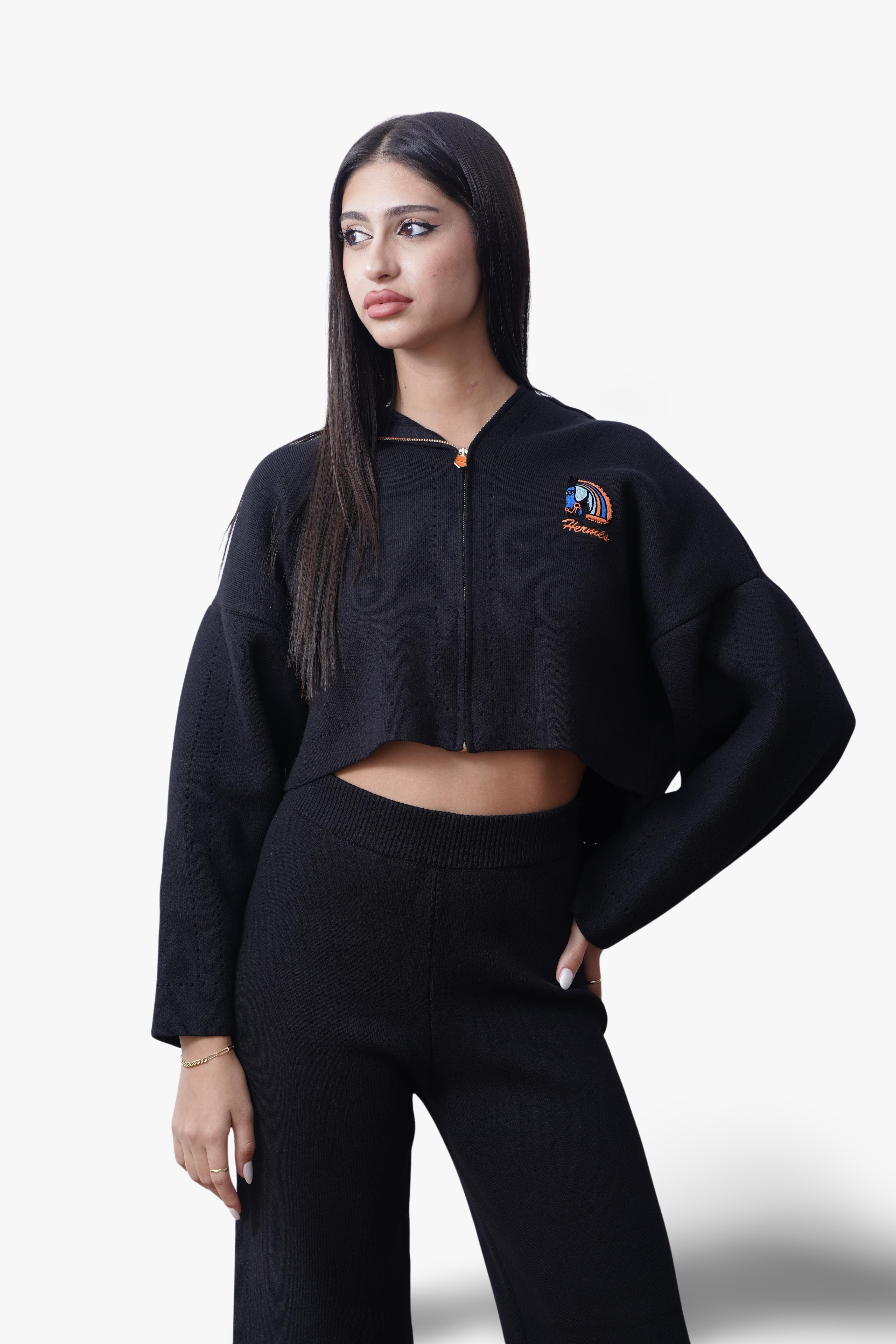 A sleek two-piece set featuring a cropped zip-up jacket with embroidered detailing and matching high-waisted pants. Comfortable yet stylish, this set is perfect for elevating your everyday look with a modern touch.