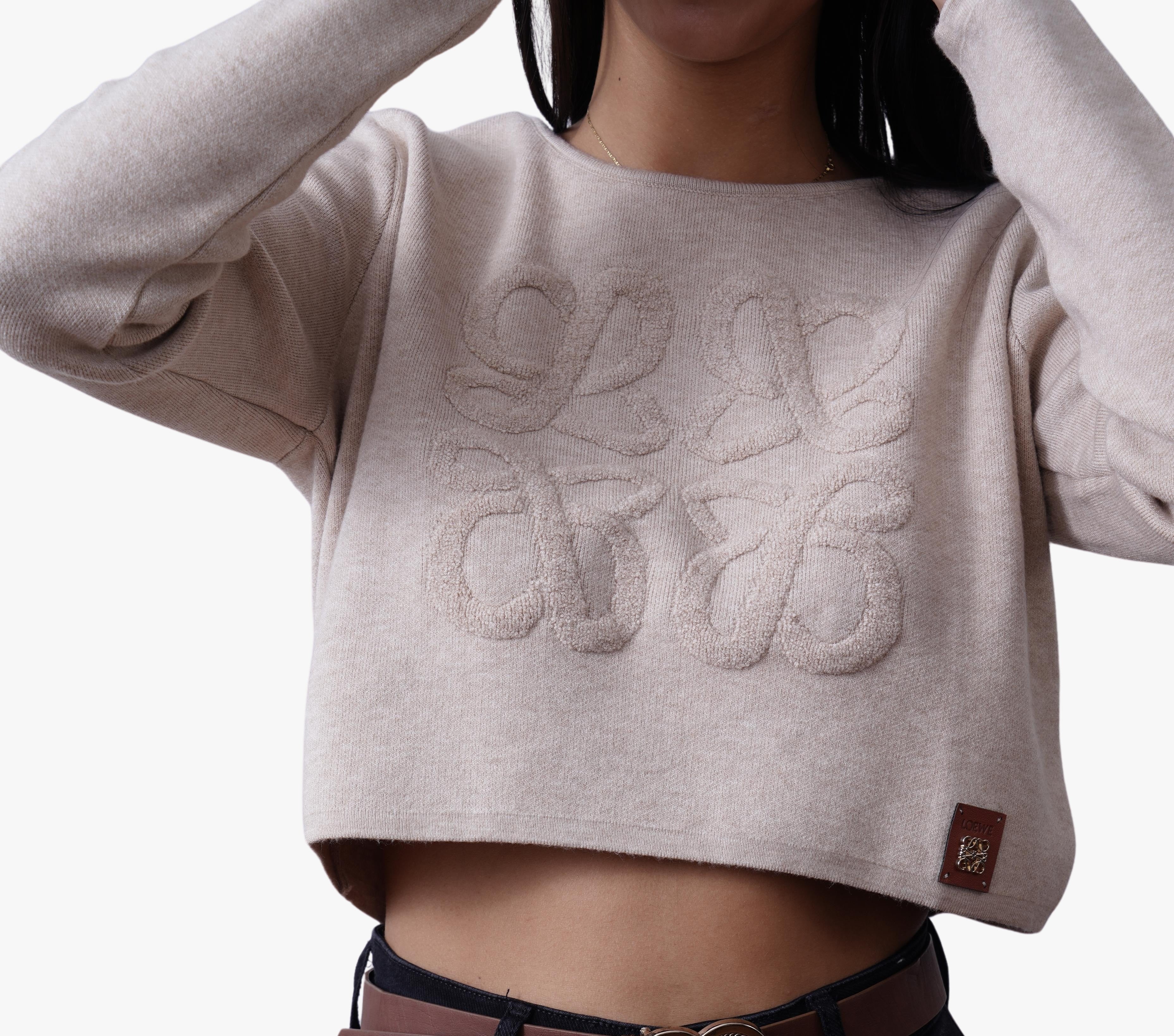 A modern cropped knit sweater in classic black or white, featuring the signature Loewe logo in tonal embroidery across the chest. Finished with a subtle leather logo patch at the hem, this piece blends understated luxury with everyday wearability.